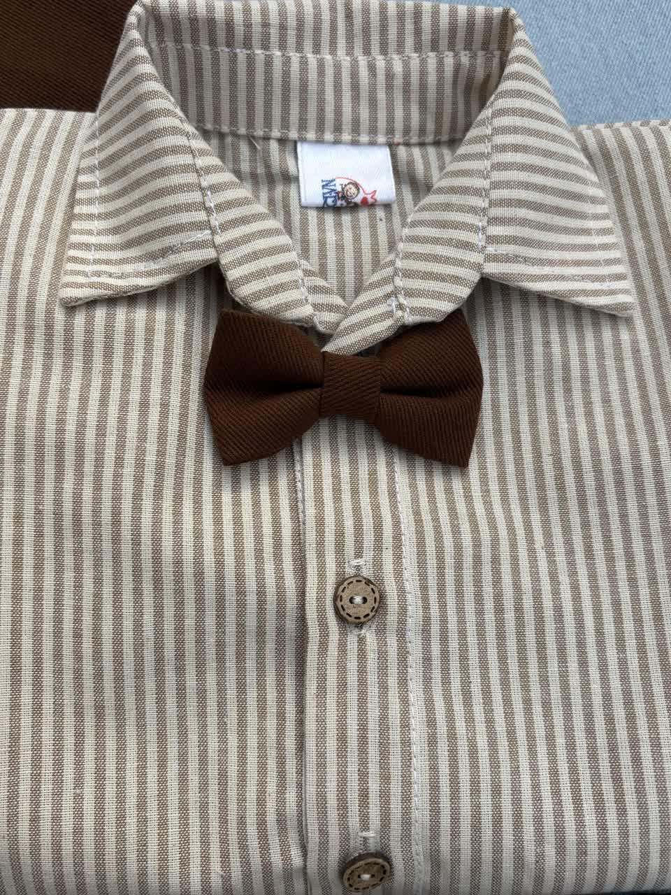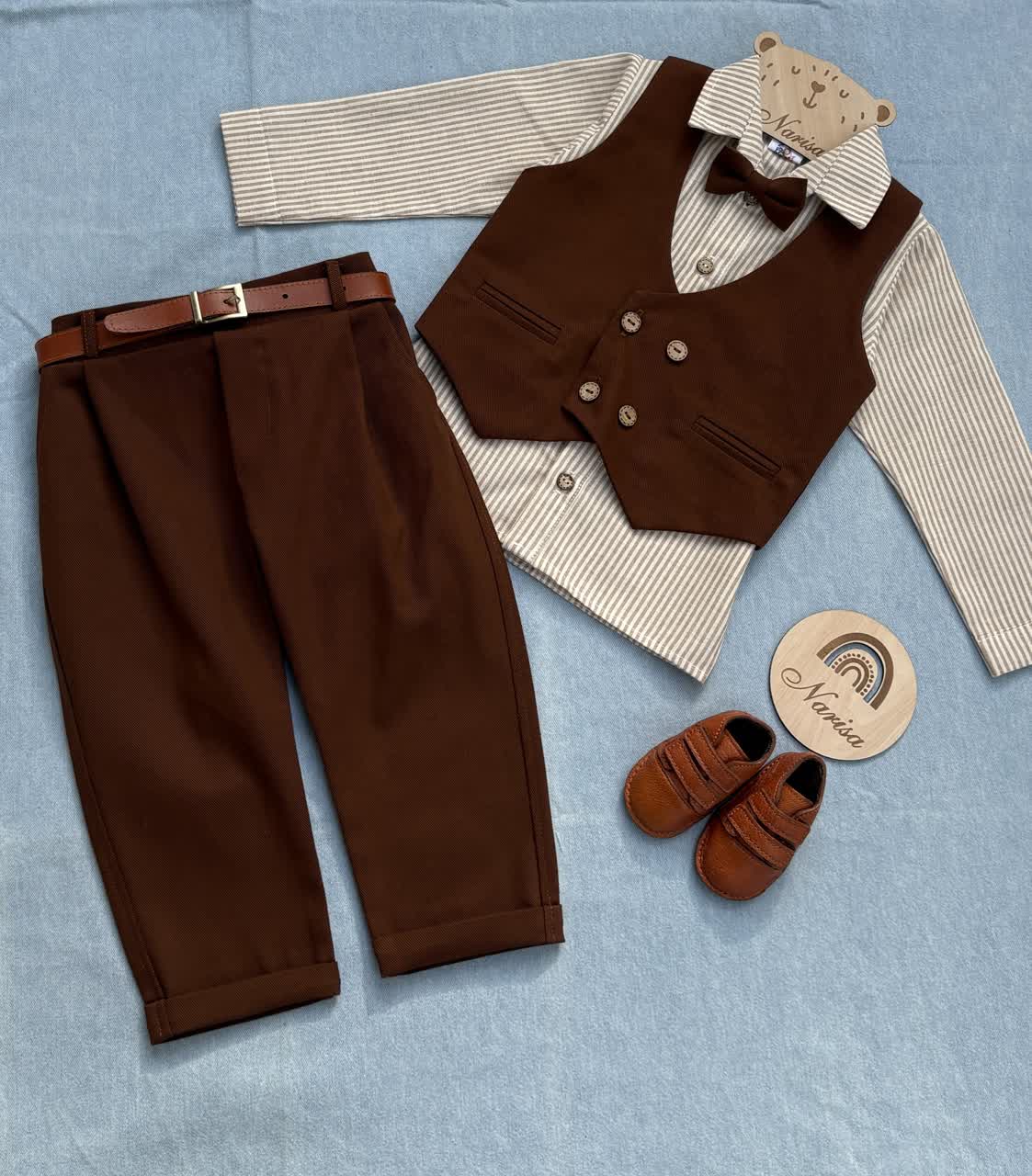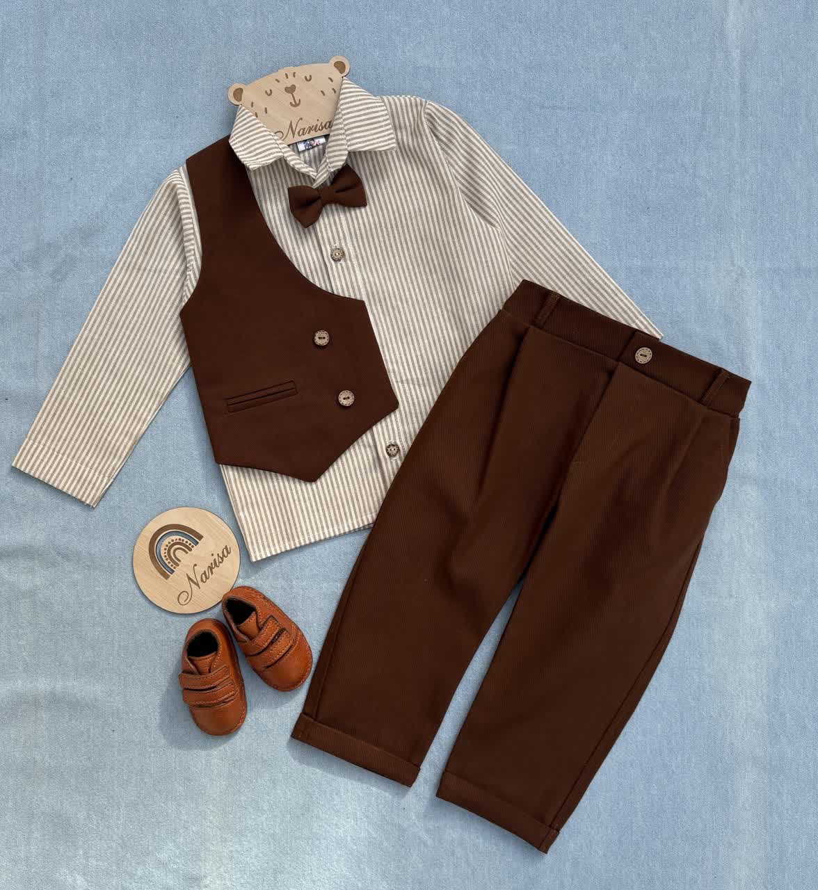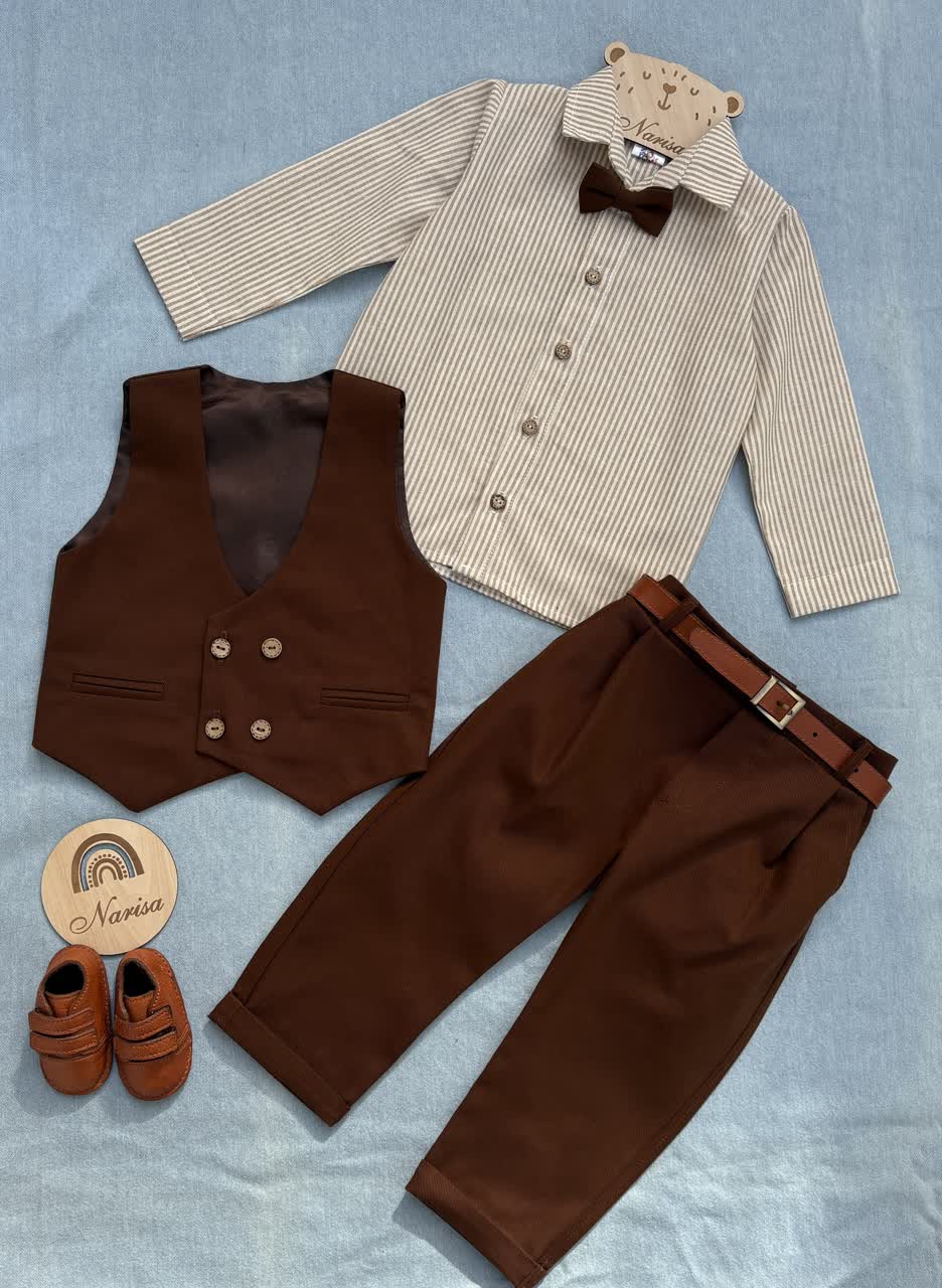 خرید ست کامل لباس پسرانه کرم راه راه، قهوه ای به همراه کت و بدون آن
